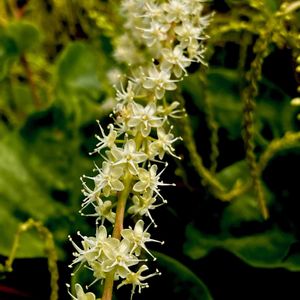 野菜の花❹-3 ものすごい勢いで繁茂しています❗️ オカワカメ(陸わかめ) *ツルムラサキ科アカザカズラ属 花期は9月〜10月 熱帯アメリカ.熱帯アジア原産のつる性多年草! 茎.葉.ムカゴ.球根まで食べることができ栄養価も高い! つるは3m以上伸び グリーンカーテンとしても利用されている! 花は雄蕊ダンシング状態で驚きました‼️ ①花色はクリームがかった白! ②カオス状態です! ③この葉が美味しいらしい! 9月24日撮影 宮城県青葉区