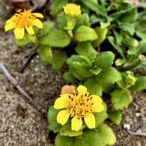 昨日は狸!今日は猫です❗️ ネコノシタ(猫の舌) 別名 ハマグルマ(浜車) *キク科ハマグルマ属 花期は7〜10月 関東地方以西〜沖縄(北陸地方以西)の海岸の砂地に生える多年草! 葉は対生し厚く卵形〜披針形で浅い鋸歯! 茎は砂上を長く這って節から根を出して群落を作る! 花は斜上した茎に黄色い頭花を1つ! ①②舌状花と筒状花から! ③奥は東京湾! ④これで1株! 畳2枚ほどの大きさ! 名前は葉に剛毛が生えて猫の舌のようにざらつく事から! (実際に触って確認しました♪) 千葉県のフォロワーさんに教えていただた場所で初見の海浜植物を見つける事が出来ました! ありがとうございました♪ 大都会の海浜植物は不思議でした〜❣️ 10月8日撮影 千葉県千葉市