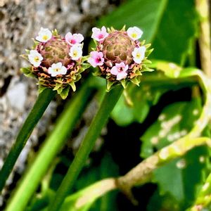 園芸種のヒメイワダレソウではありません❗️ イワダレソウ(岩垂草) *クマツヅラ科イワダレソウ属 花期は7〜10月 関東以西から沖縄の、日当たりの良い海岸の砂地や岩場に生える多年草! 茎は細長く地表を這い節々から根を出して広がります! 葉は対生し倒卵状楕円形で鋸歯があり厚みがある! 花は葉腋から花柄を出して楕円形の太い花序に淡紫色の小花が多数集まって咲き、花序はワレモコウや松ぼっくりのようでもありました! ①②花の様子! ③厚みのある葉! ④茎は砂浜を長く這います! 自生地では、絶滅危惧種にも指摘されている所もあるようです! 10月8日撮影 千葉県 千葉市
