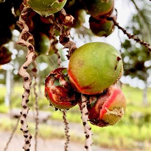 ココスヤシ 果実 *ヤシ科ヤタイヤシ属 花期は6〜7月 果期は9〜10月 南米原産のヤシの中間で、耐寒性が高い事から街路樹や公園樹に利用されて、ここ関東周辺での路地植えも可能だそうです! (流石に宮城県では見かけませんが) この海岸公園には、たくさん植栽されていて、こんな果実が目線に現れました! 果実はリンゴや梅に似た甘さ香りがあって可食だそうです! 千葉県に入るといつも南国ムードのイメージがあります❗️ 10月9日撮影 🏷️木曜日は木 千葉県 蓮沼海浜公園