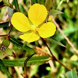 ヒレタゴボウ(鰭田牛蒡) 別名 アメリカミズキンバイ *アカバナ科チヨョウジタデ属 花期は8〜9月 熱帯アメリカ原産で関東以西の水田や湿地などで多く見られる帰化植物の一年草! 高さは50〜100cm 葉はほぼ無柄で互生し披針形〜狭楕円形! 花は黄色の4花弁で葉腋に単生し花弁の間は隙間がある! ①②花弁の間は隙間! ③茎の断面は四角で翼(ヒレ)がある! ④萼片が残る四角い蒴果! ⑤大きめの株! 名前は 茎に発達するヒレ(翼)とタゴボウは在来のチョウジタデの別名「田牛蒡」から。 今年初めて見た在来種のチョウジタデよりずっと大きな花でした❗️ 10月8日撮影 千葉県山武市