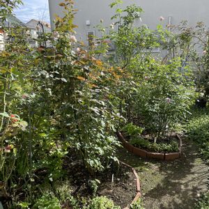①勝手口を開けるとこの場所なんです すぐ左手前は新苗から2年目のパニエ 割と伸びたがりなんだなぁ〜 夏剪定が浅過ぎた‼️ 奥はレヴリ、レヴリの左の背の高いのはシャルムです😊 絶賛つぼみが膨らみ中 ②ヒマラヤンポールズムスク 壁際に誘引してあるポールズさんは癌腫です😂 でもふわふわと、程よく咲いてくれるので、廃棄はしません ローズヒップが紅く色付いてきました💓 ③アンヌ 新苗からのアンヌ三姉妹が咲きそうです 明日のお楽しみ💕 ④⑤土替えをしてもらってバラを植え込んだので、何も無かった大地が、一年でこんなになりました🌿🌿🌿 ポリゴナム ティホンです これからお花が咲いてくると、それは賑やかで可愛らしい🥰 酷暑の夏の間は照り返し予防と、保水性アップと、他の雑草よけになるかとほっておいたのだけど、先日バラの師匠がお庭を見てくださった時、「これはバラの肥料全部吸っちゃってるし、種がこぼれたら来年はもっとすごいことになるから、抜かなきゃダメよ‼️」 と、ダメ出しされました😅💦 確かに、カミキリムシが入ってたとしても、これでは株元も見られなかなってる😨 でもお花が咲き始めて可愛らしくて…ますます抜けな〜い😭
