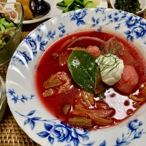 ボルシチ…赤いスープ ビーツでボルシチ作ったよ ウクライナのお料理ですって サワークリームが味を引き締めて… 美味しいわ(微笑)