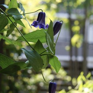 ベル型のクレマチス ロウグチ 花後に剪定するとまたつるが伸びて花が咲くので、長い期間楽しませてもらっています カットして玄関に飾りました