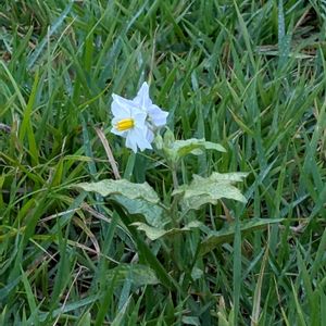毎週土曜朝8:00からの パークランが運動不足解消に😊 【ワルナスビ】 ワルナスビはナス科ナス属の多年草で、北米原産ですが、日本を含む世界各地に帰化している雑草です。 特徴: 茎や葉に鋭いとげがあり、繁殖力が強く、一度生えると駆除が難しいことから「悪茄子」と呼ばれます。 花: 6月から10月にかけて、白や薄紫色の花を咲かせます。 果実: 花の後に、直径約1.5cmの黄色い球形の果実が実ります。 別名: オニナスビ(鬼茄子)とも呼ばれます。