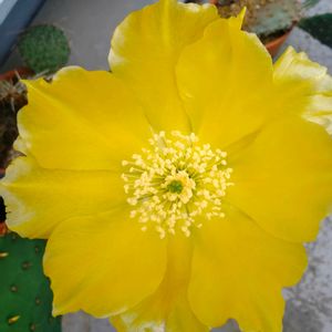 国内入手苗 Opuntia megasperma var. mesophytica 先日ご紹介した megasperma var. mesophytica がやはり蕾だったようでライトイエローカラーの大きな花を咲かせてくれました。 画像では伝わり難いのですがかなりの大きさがあります。 ただ夕方に花が咲いているのに気付き萎み始めていたので100%開花した状態を見れたら良いなと妻と話しております。 話しは変わり本日メルカリとヤフオクに新たに海外輸入のオプンチアを出品致しました。 これから迎える第2成長期。 是非とも一風変わった海外輸入オプンチアを育成なさってみて下さいませ。
