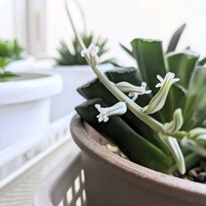 ハオルチア 宝草 ちょっと気になっていた多肉さん。 ついにお迎えしました♪ かわいい花も咲いています😊