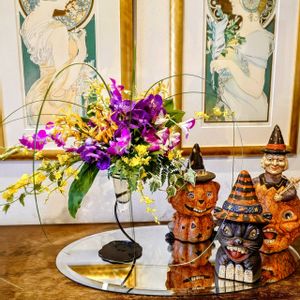 ランのブーケ オンシジウム,モカラ, バンダ,デンファレ, ルスカス,ベアグラス, ドラセナ,レザーファン びょんびょんのベアグラスで ちょっぴりハロウィン🎃ムード