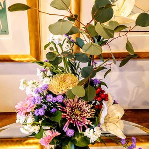 ゴージャスなマム(キク)とユリの ちょっぴり和風なフラワーアレンジメント デュラマム2種 トゥーラシャルロッタとロサーノシャルロッテ ユリ,ガーベラ,クジャクソウ,ストック, ヒペリカム,ユーカリ ポポラス,ルスカス