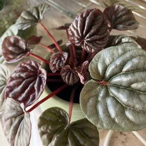 見ちゃいけないと思ってたのに我慢できず連れて帰りました😅 だって素敵💓なんですもん😁 シルバーグリーンの葉やワイン🍷色の新葉や茎がシックです♪ でも名札がなくて‥💧 ペペロミアだと思う😅
