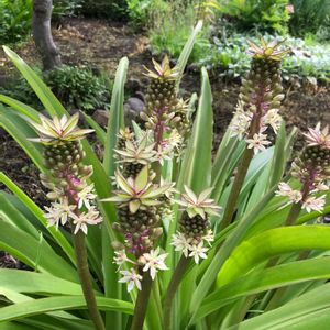 2021.10.7 晴れ☀️ 【パイナップルフラワー】 3月に3球植えて7月に2つ花が、咲き長い間楽しみました。 10月に又、1つ咲きそう。頑張って~👊😆🎵