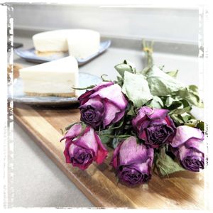 今日のおやつと バラのドライフラワー🌹 良い感じの色合いになってくれてます そのうち何か作りたいな☺️ おやつはWチーズケーキで 上がレアチーズ 下がベイクドチーズケーキ 初めて作ってみました✨️ 我慢できずにお昼休みに食べちゃった😋
