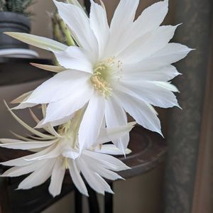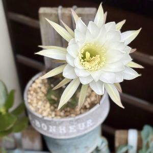 もう5年以上前から我が家にいた王冠短毛丸のお花が初めて咲きました。 花芽がついたと思ったらぐんぐん伸びて、深夜0時にはまだ開いておらず、深夜1時に開花。 1枚目の朝6時が一番開いていました。 昼11時にはもうほとんど閉じていました。 蕾も凛としていて、咲いた純白のお花は本当に美しい。 ホームセンターで買った安物なので、高価な王冠短毛丸ではなく大豪丸だという説もあるけど、一応タグは王冠短毛丸でした。もし見分けがつく方いたら教えてください。