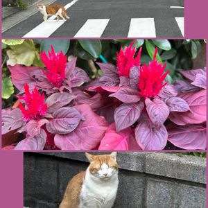 涼しくなりましたね😊 朝散歩で、ゆっくりと横断歩道を渡る ニャンに遭遇🐈 (毎回の登場すみません🙇♀️) でも、渡り切ると待っててくれて この微笑みです😸 ありがとにゃん❣️ 胴葉のお花にも出会えました🌸