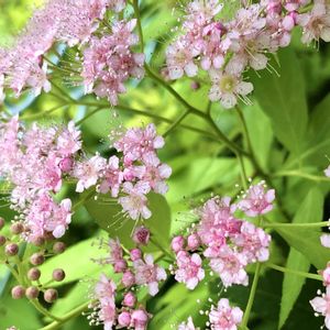 おはようございます♪(๑ᴖ◡ᴖ๑)♪ 今日の私のお花さんはシモツケさんです٩(๑❛ᴗ❛๑)۶💗💞 やっと咲き始めましたo(^▽^)o🌸🌸 🏷️ 木曜モフモフ ◎ シモツケ 科・属 バラ科・シモツケ属 和名 下野(シモツケ) 英名 Japanese Spiraea 学名 Spiraea japonica 原産地 日本、朝鮮半島、中国 開花期 5月~6月 シモツケは暑さや寒さに強く、性質が丈夫で育てやすい樹木です。日当たりが良く、乾燥しすぎない場所を好みます。明るい日陰くらいであれば耐陰性があり育ちます。ただ、光が足りないと花付きが悪くなります。株がこんもりとやや大きく育つので、どちらかと言えば地植えが向いていますが、コンテナでも育てられます。 ◉ シモツケの育て方のポイント 水やり 鉢植えの場合は、土の表面が乾いたら鉢底から水が流れ出るくらい与えます。 地植えの場合は、根付いてからは真夏に日照りが続く時以外は特に水やりの必要がありません。 肥料 4月に緩効性肥料を適量与えましょう。 病害虫 シモツケは葉や枝が伸びる頃にアブラムシがつくことがあります。アブラムシは木酢酢などで予防できます。 風通しが悪いとカイガラムシがつきやすいので、風通しの良い所で管理しましょう。