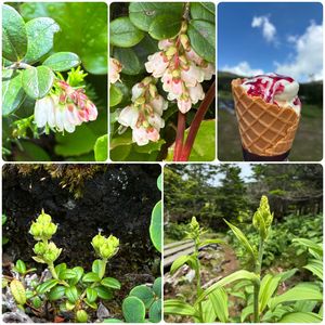 北八ヶ岳での出会い〜🌿 ↖️⬆️ 〜コケモモ(苔桃)〜 ツツジ科スノキ属 落葉小低木 今旬なんですね🎶 あちこちに沢山咲いていました💕↗️ 番外😆コケモモソフト🍨 甘酸っぱジャムが美味しい〜😋 ↙️ 〜コメバツガザクラ(米葉栂桜)〜 ツツジ科コメバツガザクラ属 落葉小低木 坪庭にて…もう実になりかけでした♪小さ〜い🤏 ↘️ 〜バイケイソウ(梅惠草)〜 ユリ目シュロソウ科 雨池山に行く木道沿いに群生\(^o^)/ 蕾もシュッ、只今成長中🎶 素敵な白いお花は私の7/1アップの伊吹山のバイケイソウを覗いて下さいね😉 2025 7/6 撮影 八ヶ岳ハイキング登山にて