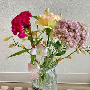 今回のお花 カーネーション ソラナム ケイトウ デンファレ スターチス セダム スモークグラス