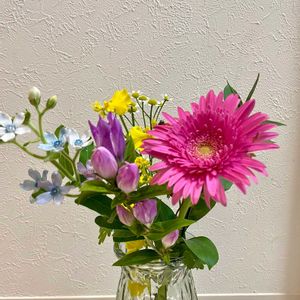 今回のお花 ガーベラ オキシペタリウム マトリカリア ローズヒップ リンドウ オンシジューム ルスカス