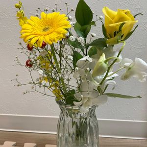 今回のお花 ガーベラ ローズヒップ デンファレ バラ カスミソウ オンシジューム ルスカス