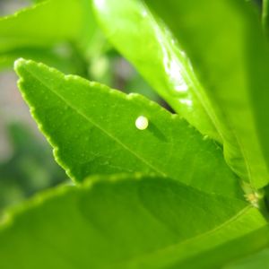 レモンの葉にアゲハチョウが卵産んで行きました。 まさに産みたての卵です。