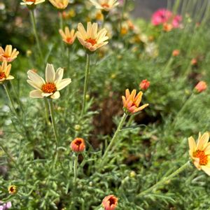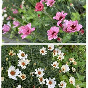 こんばんは🌙 2枚目です😂 ① ↖️マーガレットあずきちゃん🫘 ↗️マーガレット ダークあずきちゃん🫘 ダーク🫘ちゃんは親株も残って咲いてますが、あずき🫘ちゃんの親株は、室内で冬越し中に💫にしてしまいましたが保険の挿し木苗にあずきちゃんがいました💕嬉しい💕 ↙️ローダンセマム ムーン ↘️ローダンセマム アプリコットジャム 毎年外での冬越し失敗してましたが今年初めて成功💕 地植えローダンセマム3種類は全て💫に、鉢植えのこの二つは、どちらも成功💕 うちでは地植えより鉢植えでの方が越冬成功しました\(//∇//)\嬉しい💕 諦めないでよかった💕 ②プリティコートピーチさん🍑、 今朝の姿、花色の変化、どれも素敵な花色です٩(๑❛ᴗ❛๑)۶ ③オダマキも、まだ咲いてます🌸 ④ベロニカもまだまだ咲いてます🩵 ⑤ちょっと離れてみるとわしゃわしゃ🤣 色んなお花が咲き出して、どんどん蕾をつけたりワサワサして来たり😂 オダマキさん、大きくなりすぎたのでお花終わったら移動して、風通し良くしたいです💕 成長した姿を想像して植えなきゃダメですね😂
