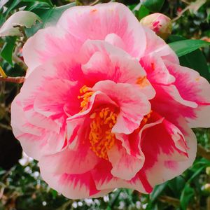 おはようございます☀ ツバキ“光源氏” 淡紅色地に紅色の縦絞りや白色の覆輪が入る、牡丹咲き、散りしべ、大輪のツバキです💖 江戸時代後期の品種です❣️ 華やかな雰囲気で洋種のように見えますが、1859年の「椿伊呂波名寄色附」という書物に載っている古い品種です😉 内側の花びらは小さめで、強く波打っていますので、牡丹のように見え、横から見るとバラのようにも見えます👀✨ 「光源氏」という名前も素敵ですが、フリフリがとっても可愛いツバキでした💕 🍀have a nice day🍀