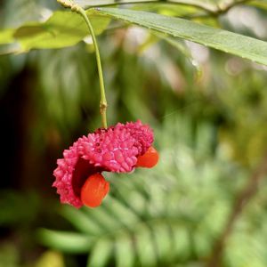 赤い実🔴イロイロ・:*+. 《スライドpic》 ①ツリバナ・アメリカーナ 初めての出会い💓 秋にドリアン形のような赤い実をつけ、熟すと裂けて中から赤い種子が現れます…この品種は栗のイガに似た実の形や、涼しげな細葉が特徴的な珍しい種類で、紅葉も美しい🍁 …また、見に行こ‼︎😍 ②ツリバナ うん?、、葉っぱ🌿にしがみついてるのは蝉の抜け殻~😆 ③ハクサンボク ④クロガネモチ ⑤ウメモドキ