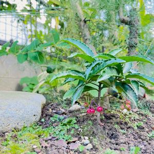 お隣から舞ってきたマンリョウ𓅯 雑多な庭に赤い実をつけました🍒