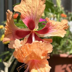 玄関前のハイビスカス常夏の香り.サニーシティ 背景の松葉牡丹も満開で、たくさん咲いてます