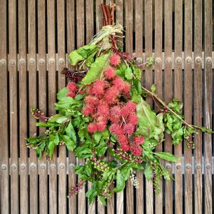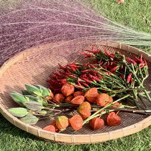 秋の贈り物 畑.庭から ホウズキ タカノツメ 花オクラの実 グラス.カピラリス 秋色スワッグ作れるね!