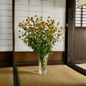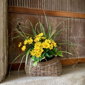 籠花 〜蔵カフェにて〜 秋の庭を籠に ススキ ナルコユリ ヒメヒマワリ2番花