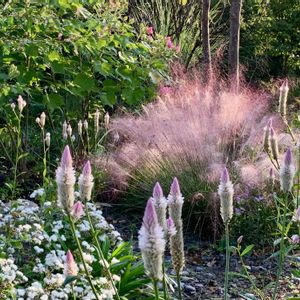 輝くグラス 朝日に 霜をまとったグラスが輝いている 秋の庭を彩る ミューレンベルギア カピラリス セロシア(ノゲイトウ) 秋の庭もなんていいのでしょう✨