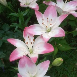 今日のお花 「ユリ」 スカシユリ・シュガーラブ、 咲いていました。💗 花びらの先が、ピンクで可愛いです。💗😍 3年目のお花です。 4本新芽伸びました。 残念ながら、1本虫に根元かじられ、折れてしまいました。 花瓶で3輪咲きました。 この写真は、合計蕾8輪です。 今、最後の1輪咲いています。 ③ガーデンプリムラ アラカルトシュシュホワイト 今頃、1本咲きました。 5輪位咲きそうです。🤍💚 葉は、虫にかじられ、穴だらけです。🌿😂 ④ナデシコ 白のヒゲナデシコと一緒に咲いているお花です。 このお花、投稿忘れました。😂 血管が見える見たいで、 好きになれません。😂