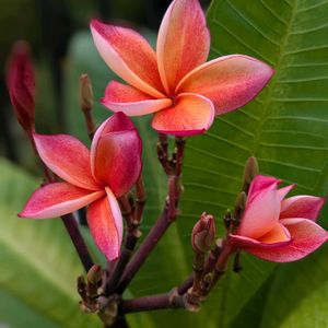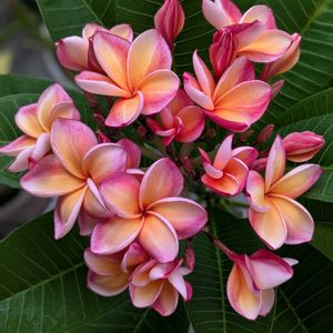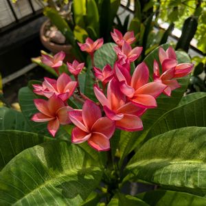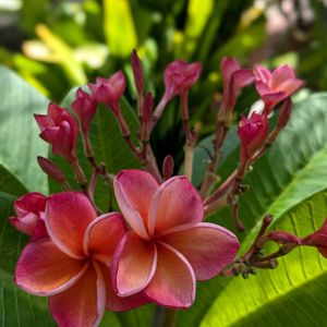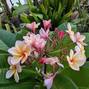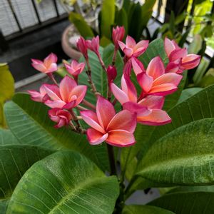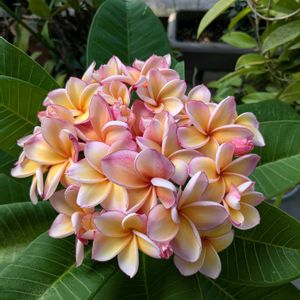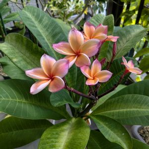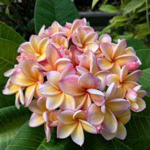 プルメリア一番花です‼️ 去年欲しかった苗木を処分セールで買い求め…色、形も分からずワクワク👍😅 それが今年初めて豪華に艶やかに素敵にブーケ咲きに〜👏👏👏🥰🎶🎉🎊 二番花はワイン🍷カラー色合いに〜素敵に長期間咲いているね👏😃🎶 育てる喜びを味わっています…感無量✨✨✨ 何度見ても凄いなあ〜🎊 癒されてね〜🙋💞
