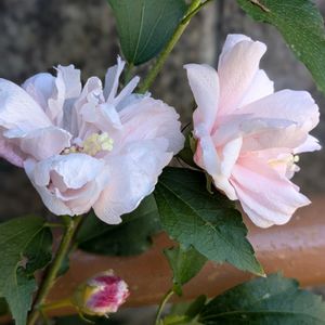 お早う御座います〜☀ 猛暑が続いています💦 日々の水やり頑張っています〜💪🥰🎶 挿し木からの八重ムクゲ淡い🩷が咲いている‼️ 嬉しいなあ〜ルンルン💖 二階テラスでは水草ホテイアオイが次々と素敵に咲いているわ〜👏😃🎶 ホヤ.サクラランも3度目が次々と満開に〜🈵⤴️⤴️ プルメリアも4度目の蕾が!! 楽しみにね〜🙋💞🎶