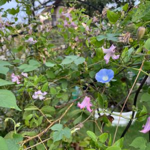 おはようございます😃 今日も朝から風もなく青空が広がっています☀️ ほぼ毎日全国最高気温ベスト20に並ぶ当地🥵 もう朝から30度なんて普通だわと開き直り。 夏休みも終わるというのにね、子供たちの体調も心配です。 今朝の庭から クレマチス踊場が元気✨ いつの間にかアメリカ朝顔が絡みついて可愛いコラボ😍 厄介者でも可愛いものは可愛い💕 ブルー🩵が涼しげです。