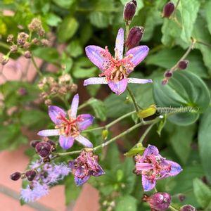 おはようございます😃 時々陽は差しますが雲に覆われた朝です。 たくさん洗濯したけど晴れるかなぁ?😅 今日も元気にいきましょう❣️ 今朝の庭から ①②③今日のお花 ホトトギス✨ 今を盛りと咲いています。 ④シュウメイギクもいっぱい✨ ⑤バラ レイニーブルー✨ 小さい花だけど久しぶりに会えて嬉しい🥰
