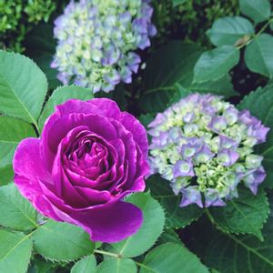 おはようございます(*^^*) バラ ミネルバと紫陽花 紫のコラボレーションです💜💜💜