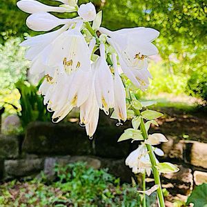 大きな根生葉の間から花茎を伸ばし、その先に漏斗状の白い花を多数つけて咲く白い「大葉擬宝珠(オオバギボウシ)でおはようございます✨🌿🤍🕊️🌿✨ 早くも夏の庭では、ミンミン蝉が輪唱のように鳴き声を響き渡らせていました☀️👒🎶 "オオバギボウシ"は、東アジアの中でも特に、日本に広く分布するキジカクシ科の耐寒性多年草🇯🇵 特徴あるハート形の大きな葉は、春先に「ウルイ」として市場に出回り、山菜としても食されている身近な植物ですね😋❣️ 花名は、蕾の形が橋の欄干の擬宝珠(ぎぼうしゅ)に似ていることから、「ギボウシ」と名付けられたようです🌁 ー花言葉は、「静かな愛」、「鎮静」…他。