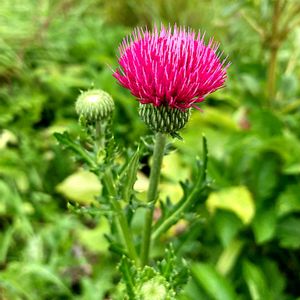 夏蝉の輪唱が繰り返し響き渡る野原に、凛と咲く鮮やかな野薊(ノアザミ)」で、おはようございます🌳🍃🎶🚶♀🎶🍃🌳 "野薊"は、日本や台湾、中国、朝鮮半島等東アジアが原産のキク科の多年草🇯🇵🇹🇼🇨🇳🇰🇷 花の付け根の総苞に鋭い棘があり、迂闊に触ると痛い目に遭う(=「あざむ」という古語で、"驚きあきれる"の意)ことから、花名の由来にもなったのだとか🌸💓🫣 また、かつてスコットランドがノルウェー軍に攻められた際に、裸足の兵士が濠に生えていたアザミを踏みつけて、悲鳴のような痛々しい叫び声を上げ侵入が露見してしまった…という逸話から、"国を守った花"のシンボルとしてスコットランドの国花に選ばれたという史実も知ることができました🏴⚔🇳🇴 ー花言葉は、「独立」、「高貴」…他。