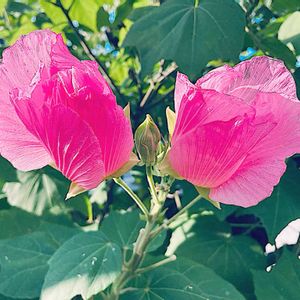 美しいピンクの透明感のある「酔芙蓉(スイフヨウ)」で、おはようございます✨🌸🥰🌸✨ 仲良く綻び始めた酔芙蓉が、絶妙な開花のタイミングを待ち望んでいるようでした💞 "酔芙蓉"は、中国原産の落葉低木🇨🇳 花名の通り、朝から夕方にかけて花の色は白から淡いピンクへほんのり色づき始め、夕方にかけて、更に濃い紅色へとドラマチックに変容してゆきます。 これは、花弁内で"アントシアニン"(色素)が合成されることによって起こる現象で、気温が高ければ高いほど変化が速く進むようです💓 酔芙蓉の美しい色彩変化に、今夏の厳しい酷暑が貢献している側面もあるんですね➰🍃🤍🩷❤🍃☀ ー花言葉は、「淑やかな恋人」、「幸せの再来」…他。