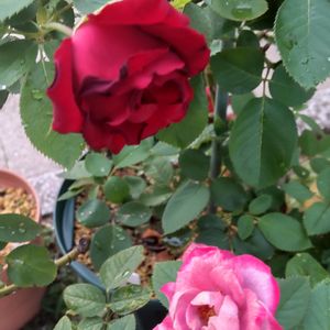 おはようございます🌼 今朝の ベランダ✨ 春は いまひとつだった 薔薇オマージュ バルバラに 綺麗な二番花が😍 目が覚めるような 赤✨💍✨