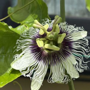 パッションフルーツ 又の名を 果物トケイソウ 初めて見た人は なんじゃこりゃ?! となってしまう複雑な造りのお花。 育てて四年目位ですが、 去年初めて実を収穫。 今年も花が咲いて実が付いてきましたよ~😉👍️✨ 冬も屋外ですが、130センチほどの大株になり、 暴れん坊です!!