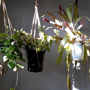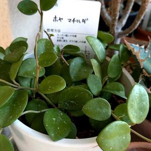 ホヤ🌱 先日お迎えした2つめのホヤのマチルダさん💚丸い葉っぱにゴミ?と思ったらこういう模様でした😆🌱ツルがたくさんあるのでこの子は吊り下げにしようかな😊🌱3枚目のカルノーサは白い葉っぱでツヤがあって美しいです😍✨
