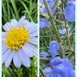 こんにちは😊 今日2枚目は野菊達🌿💜🌿 ①多分ノコンギク🌿💜🌿 キク科シオン属 ②ノコンギクの総苞はワイングラス🍷型だけど少し平たいので交雑種かも❓️ 葉っぱはザラザラ🌿 ③全体の姿🌿💜🌿 ④こちらはシロヨメナ🤍 キク科シオン属 ⑤名前にヨメナと付きますがノコンギクと同じシオン属なので総苞はワイングラス型🍷の球型🌿🟢⚪🟢🌿 ああ、ややこしい🤣 🏷水曜日は水色 午後も宜しくお願いします😊 🏷彩月(いろどりづき)の青い花2025 🏷山野草マニア ①②③いつもの散歩道で🌅2025.9.29 ④⑤昨日の高尾山で🏕️