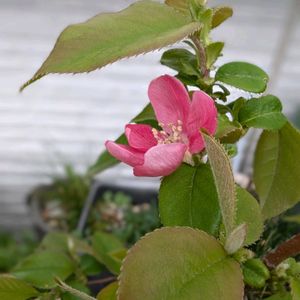 今日のお花は小さな鉢の花梨です ①一輪だけのカリンの花(25/4/14)②天人草③満開ホトトギス④野菊⑤ヒオウギの実