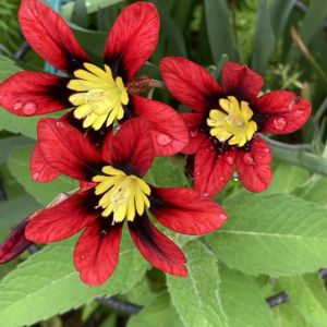 仲良しご近所花友さんの庭を見てきました。 ①スイセンアヤメ赤 ②ミニチューリップ ③セイヨウオダマキ ④スズランの花と蕾 ⑤シラーペルビアナ蕾 🏷️優しい花に癒されて