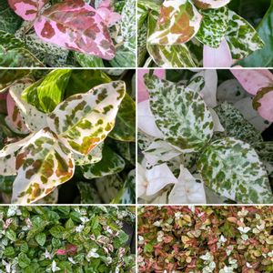 1️⃣2️⃣ピンク色の斑入りの葉のコントラストが美しいつる性の植物のハツユキカズラです。 3️⃣オウゴンカズラが鉢いっぱい広がってます。 4️⃣斑入りのオリヅルランに花が咲いてます。 5️⃣斑入りノシラン 🏷️斑入りの葉 🏷️2のつく日は斑入りの日