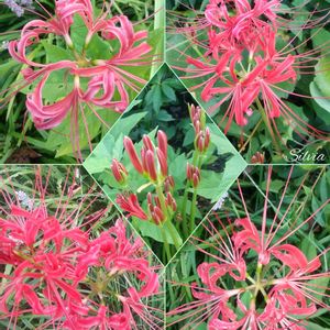 9/23 (火) ☆。.:*・゜🌥 ①②❤️💚曼珠沙華💚❤️マンジュシャゲ ヒガンバナ 彼岸花 学名❀✿Lycoris radiata 英名❀✿Red spider lily 和名❀✿彼岸花 別名・流通名❀✿曼珠沙華(まんじゅしゃげ)、死人花(しびとばな)、火事花(かじばな)、リコリス ※ヒガンバナ科 ※ヒガンバナ属 原産地🔷中国 ♣️彼岸花は、秋になると30~50cmの花茎を真直ぐに伸ばし、その先に数個の花を放射状に咲かせる。花一つ一つを見ると、花びらは細く縁が少し波打っていて、先端が反り返り、しべ類が飛び出すような独特のフォルムをしている。彼岸花の特徴は、花が咲き終わってから葉が出てくるところで、花が咲いていた場所に濃いグリーンの細い線のような葉を伸ばす。この頃には花は枯れてなくなっている。♣️ ③④🩷🤍💚ハツユキカズラ💚🤍🩷 ⑤💜🤍🌿ヤブラン🌿🤍💜 9/22付📸📱公園広場花壇🏞庭花壇にて❤️💚🩷🤍🌿💜①②今日のお花❀✿