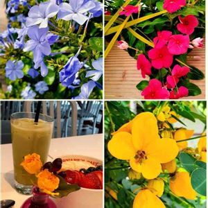 おはようございます💛 オアフ島4日目🌴 ダイヤモンドヘッド周辺で沢山の花に遭遇※。.:*:・'°☆ アサイボウルを食べに入った 『ボガーツカフェ』は テーブルそれぞれにお花が飾られていました🍓